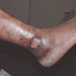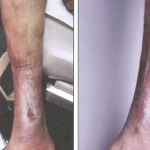 A severe consequence of chronic venous insufficiency or CVI syndrome, venous stasis leg ulcers result from prolonged and extensive venous congestion and hypertension in leg veins. Impaired exchange of oxygen and nutrients with cellular wastes at the capillary level leads to skin discoloration, thickening and ulcers of the lower legs. Almost always, venous stasis leg ulcers are caused by incompetent perforator veins in the calf.